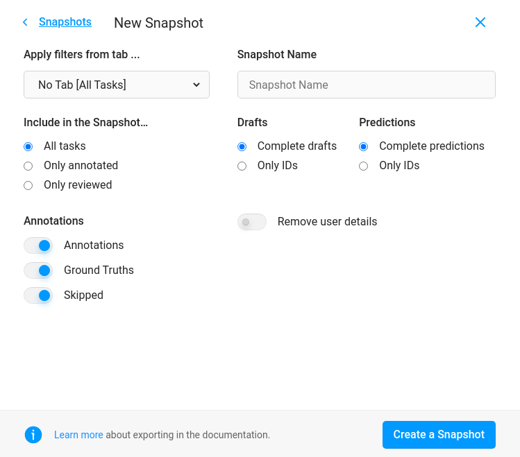 5. Include in the Snapshot…: Choose which type of data you want to include in the snapshot. Select All tasks, Only annotated tasks, or Only reviewed tasks.